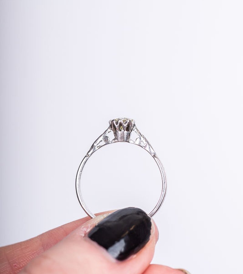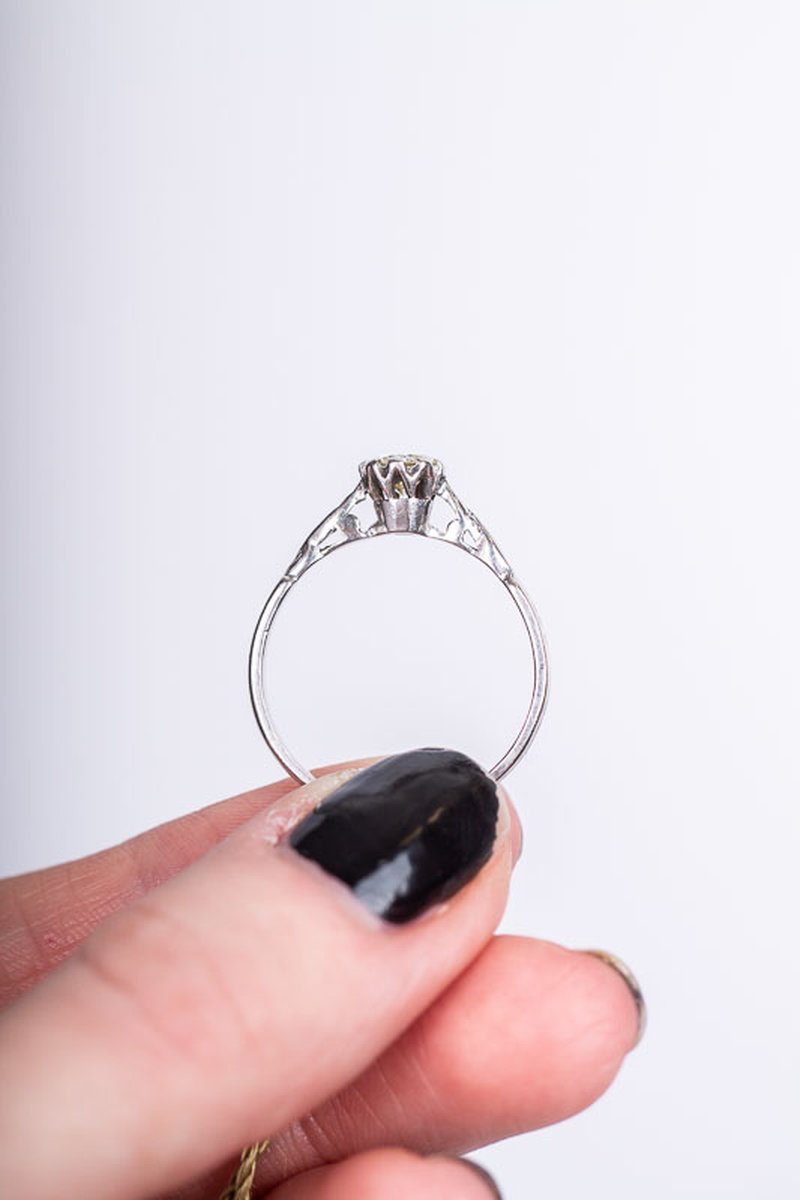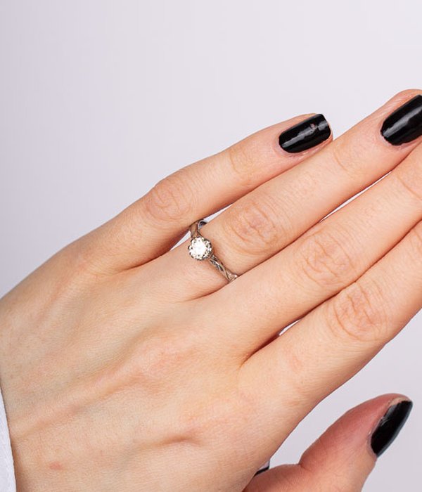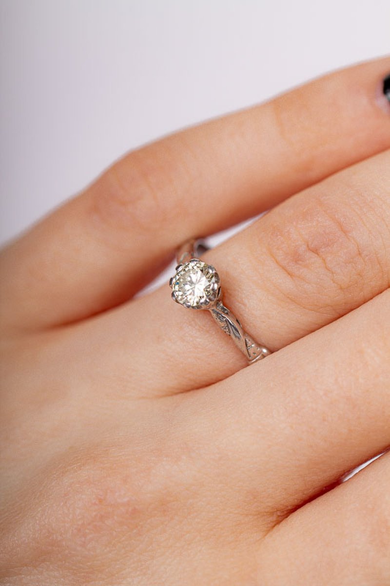 Förlovnings- eller vigselring med 0,50ct diamant. Synligt lätt gulaktig för ögat, ej kvalitetsbestämd. En vacker ring med mycket charm för dig som söker ett unikt hantverk.