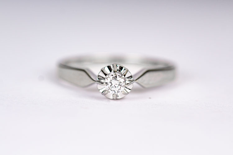Nätt vintage solittärring med en 0,10ct briljantslipad diamant. Passar som förlovnings- eller vigselring. Går att storleksändra.