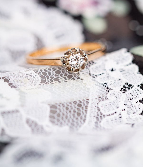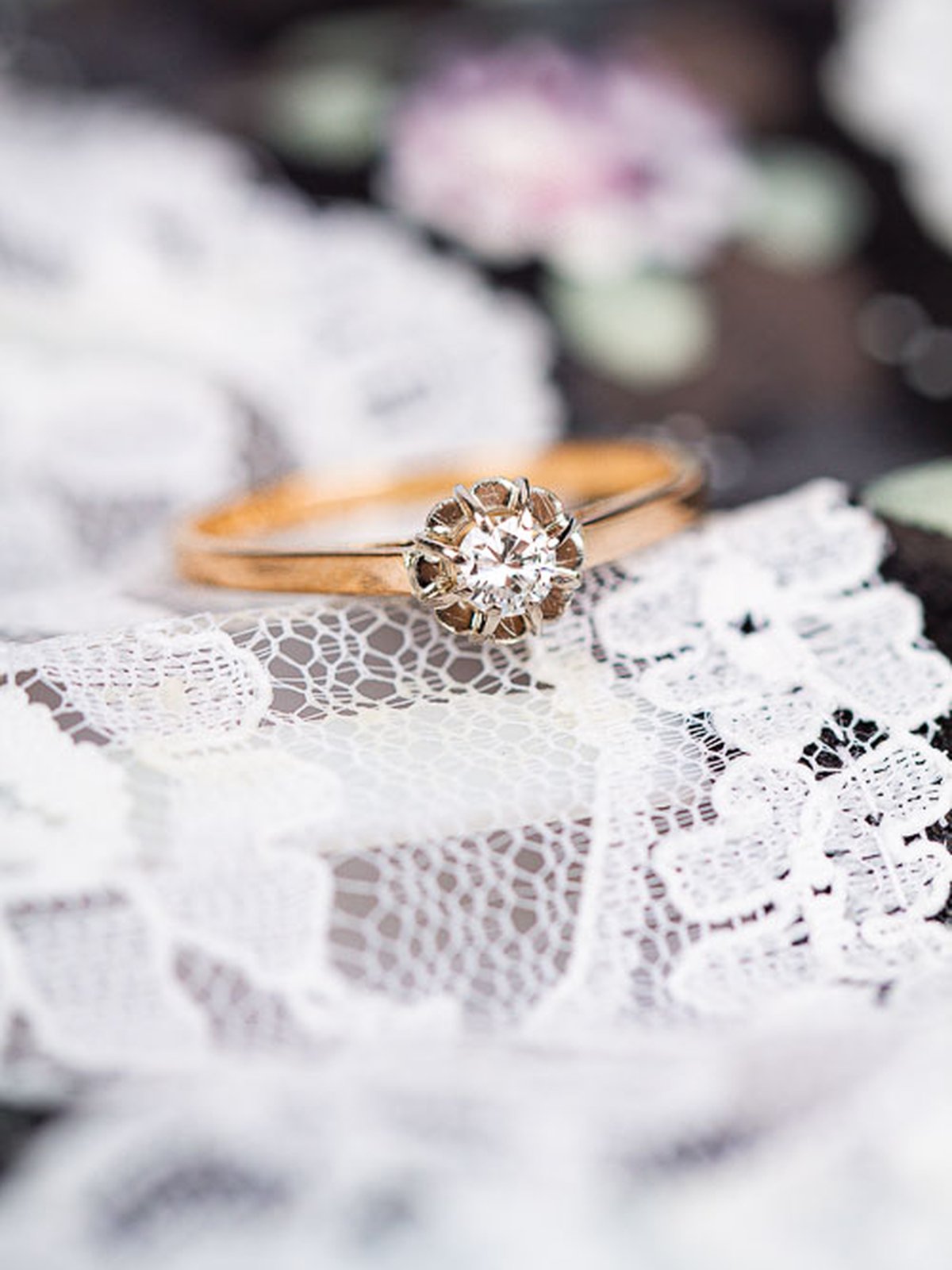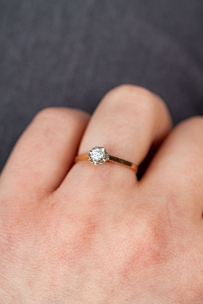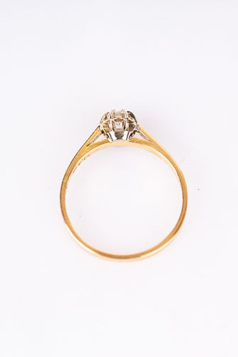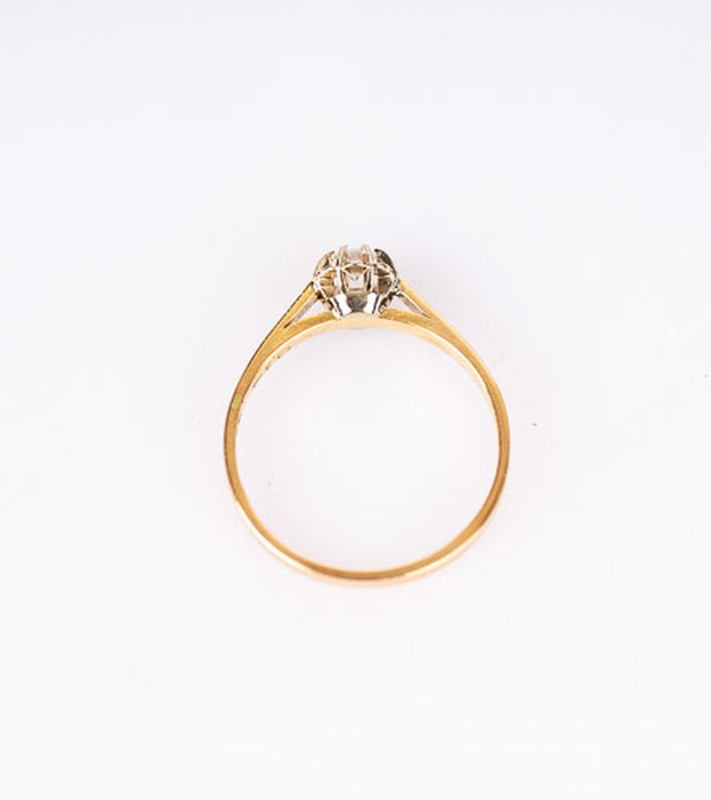 Vacker solitärring med skena i rödguld infattning i vitguld. Solitärstenen är 0,14ct - ej specificerad kvalitet eller färg. Klart vit för ögat.