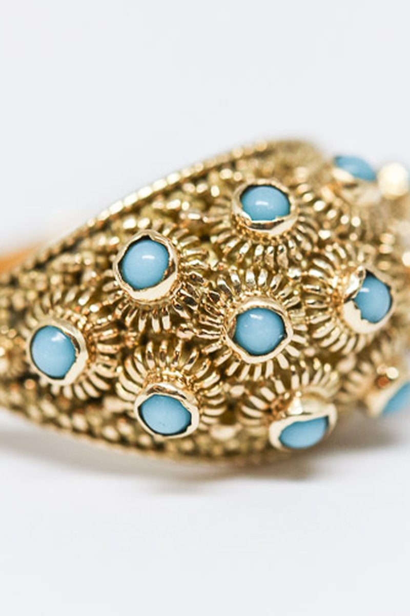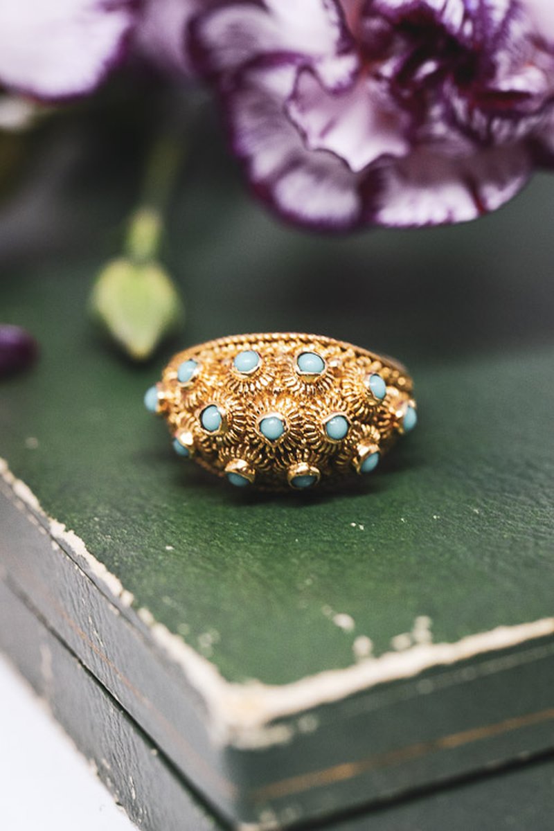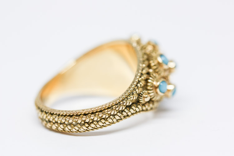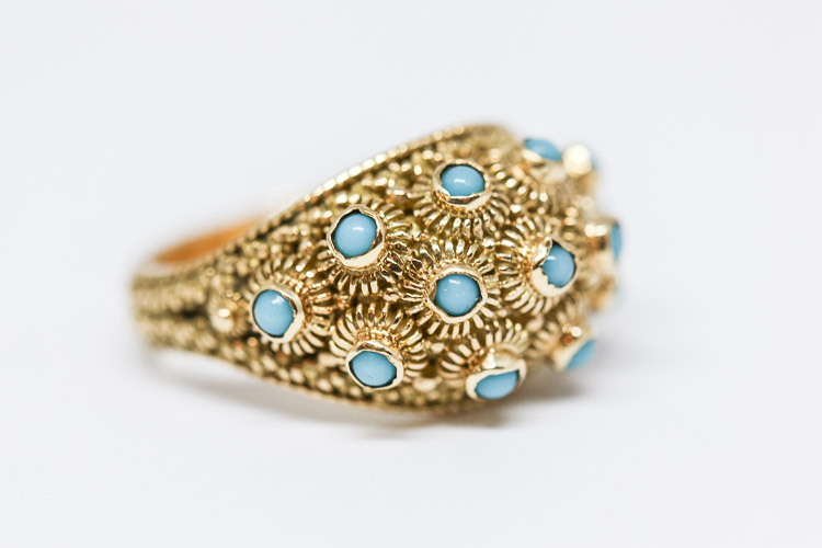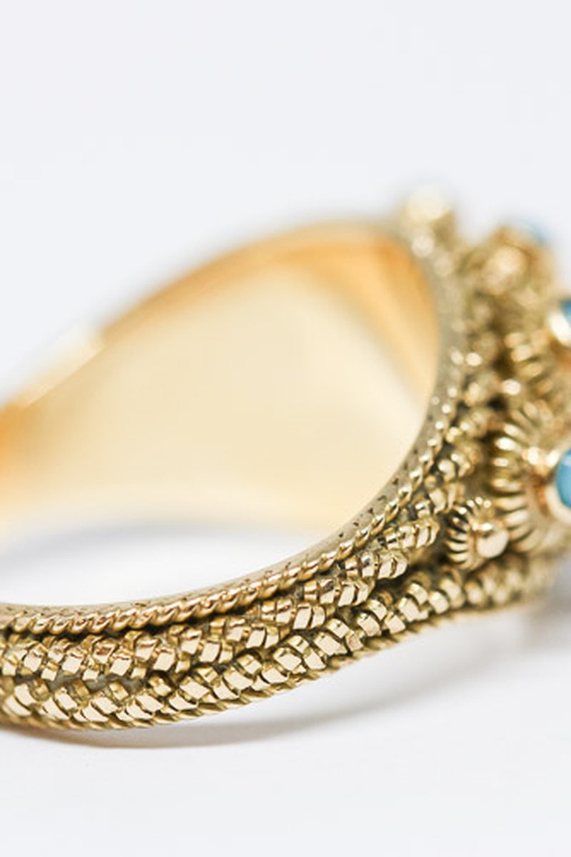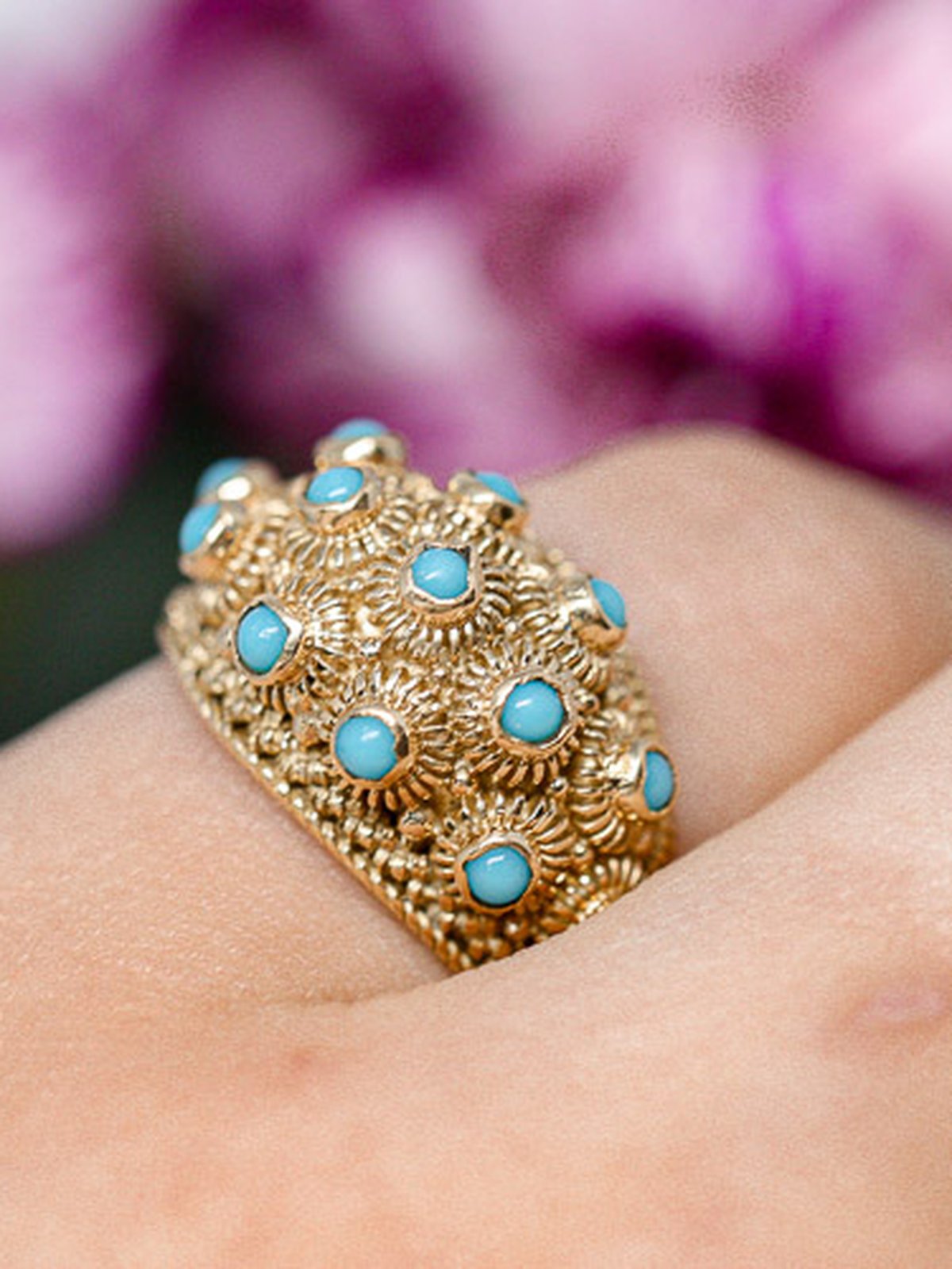 Hantillverkad vintagering med 13st 2mm rena blå turkoser. Denna ring sitter bekvämt på fingret med en lätt rundad insida och har helt fantastiska detaljer.
