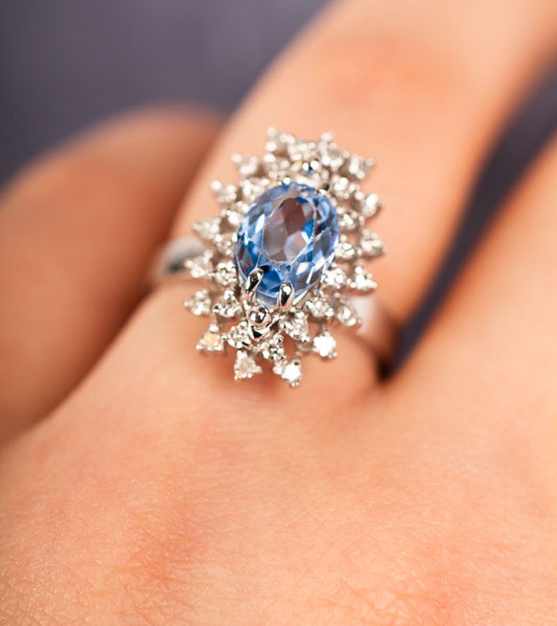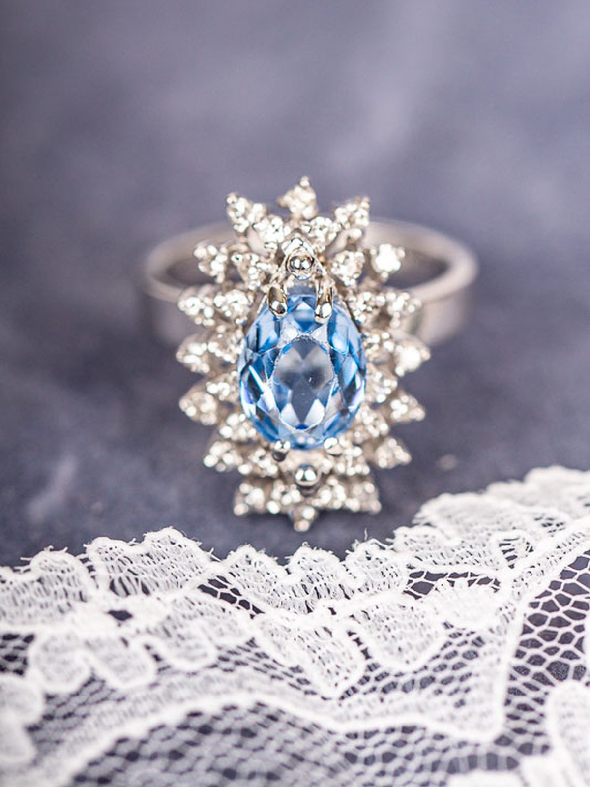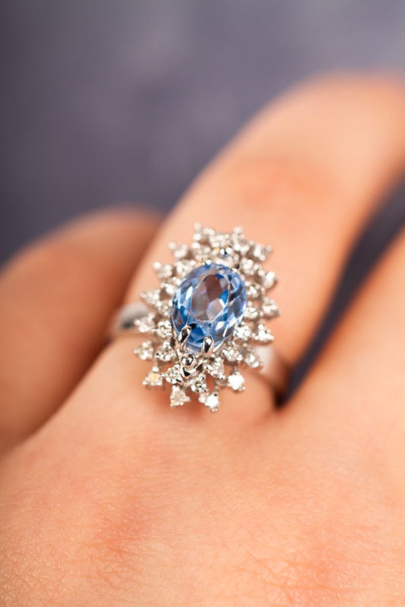 Fantastisk cocktail-ring med en vackert blå syntetisk spinell som omringas av totalt 0,32st åttkantsslipade diamanter.