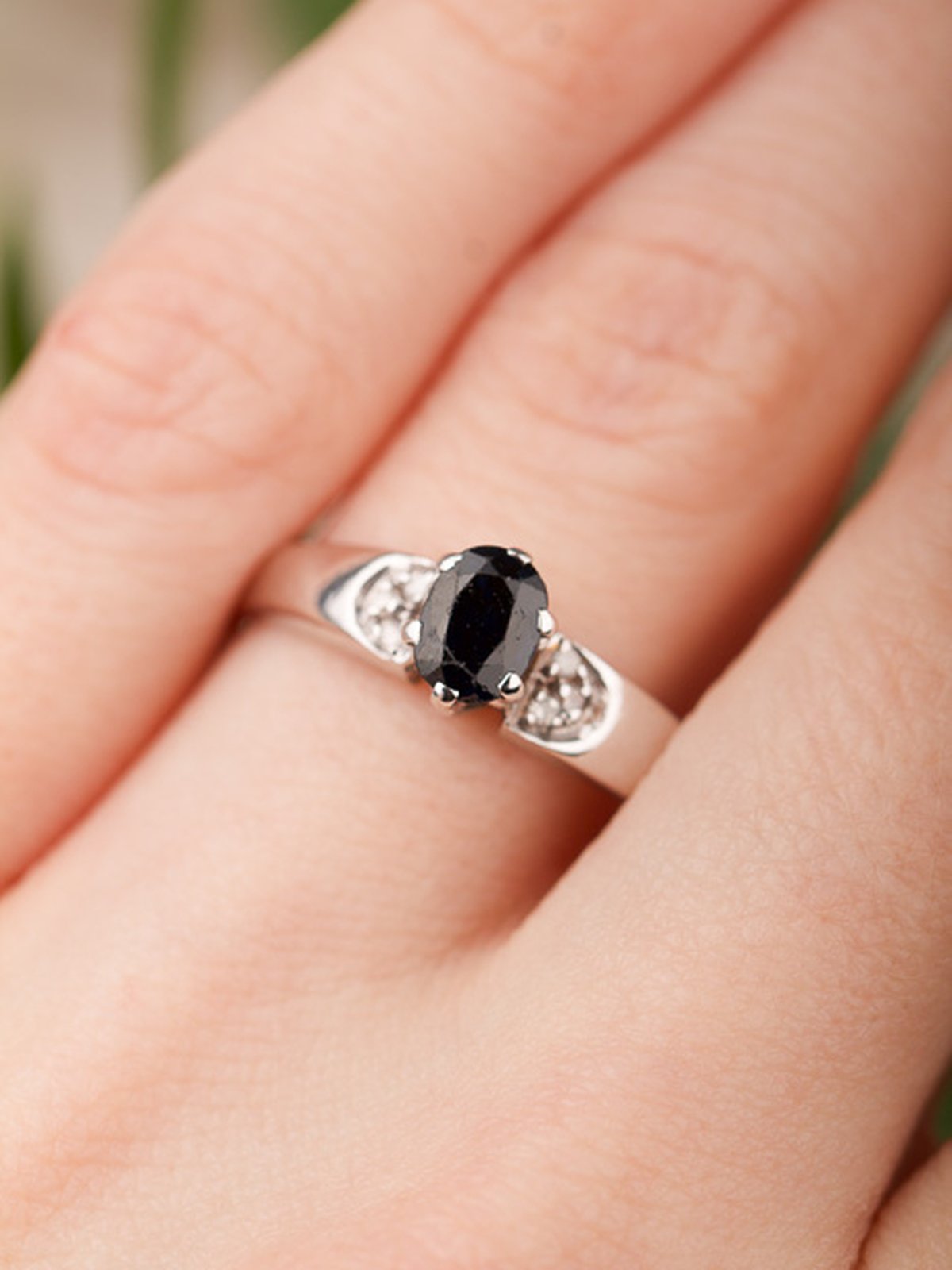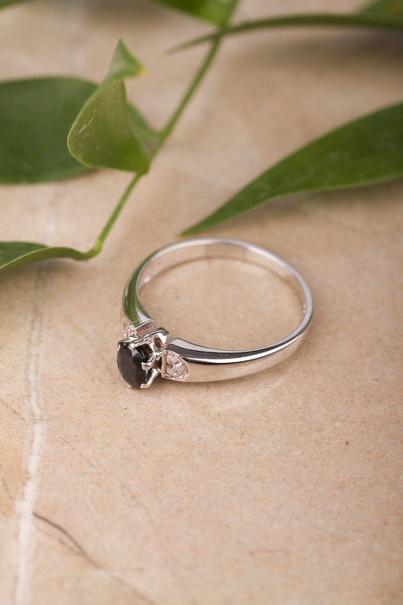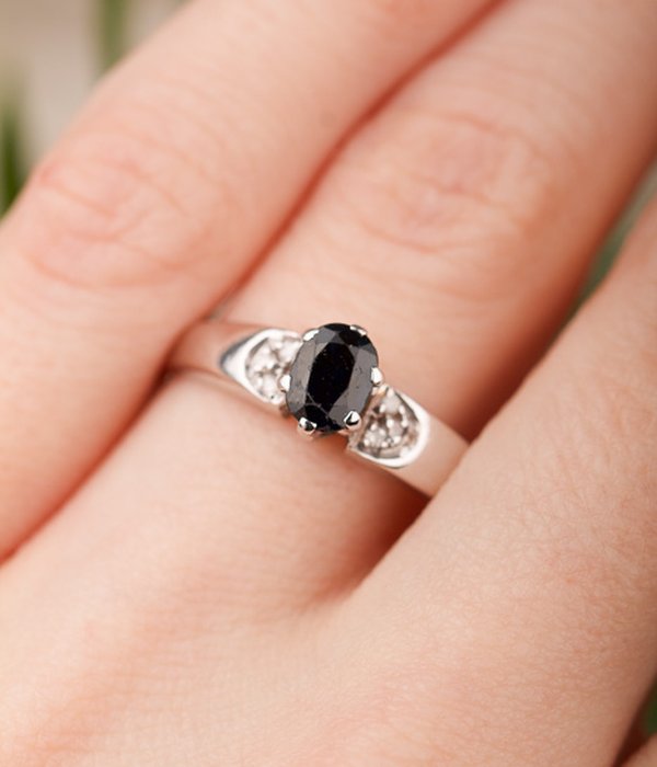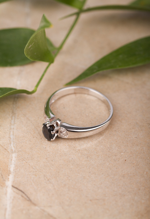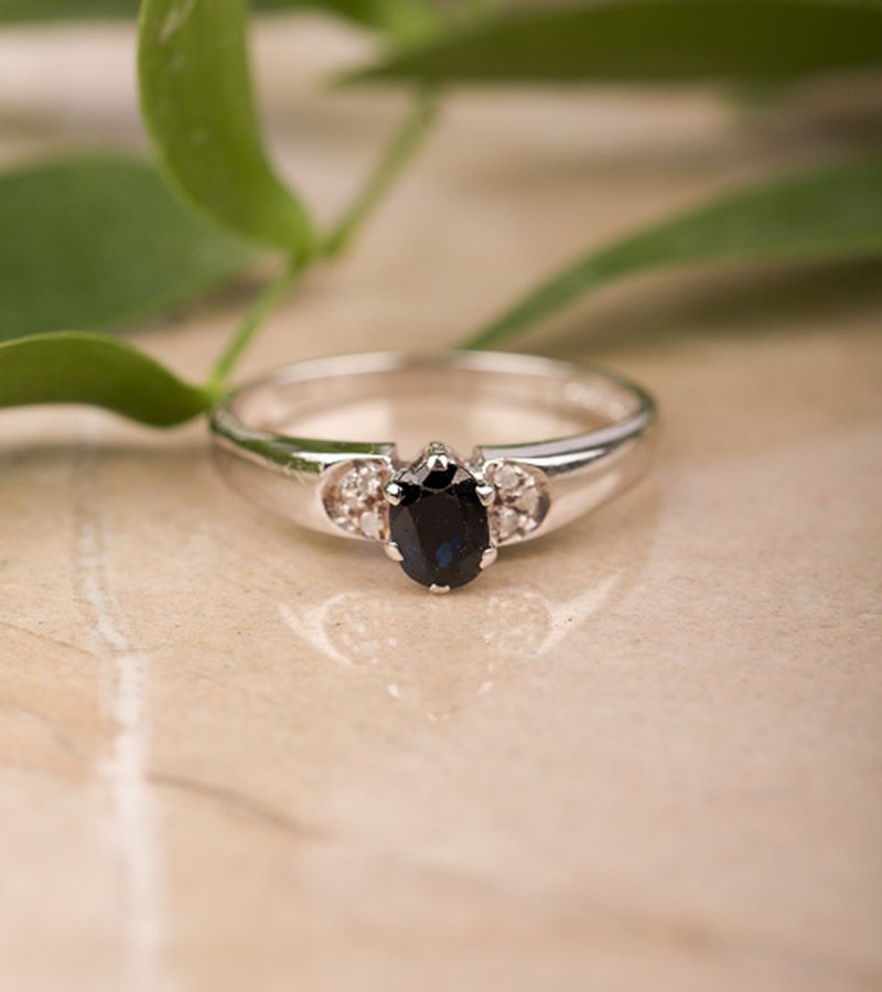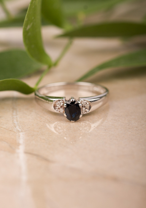 18K vitguld, oval mörkblå safir 4,4 x 5,5 mm. Åttkantsslipade diamanter 6 x 0,01 ct