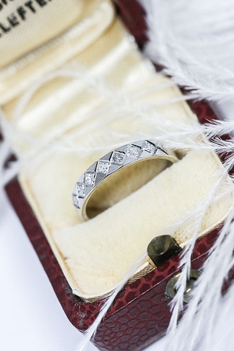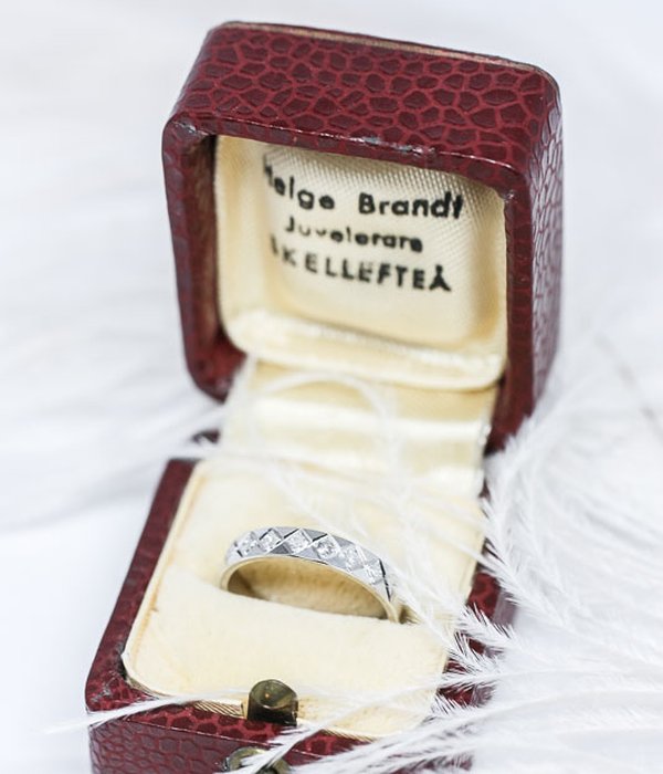 Vacker vitguldsring med diamanter infattade i ett vackert mönster. Går att storleks ändra och gravera mot kostnadsförslag.