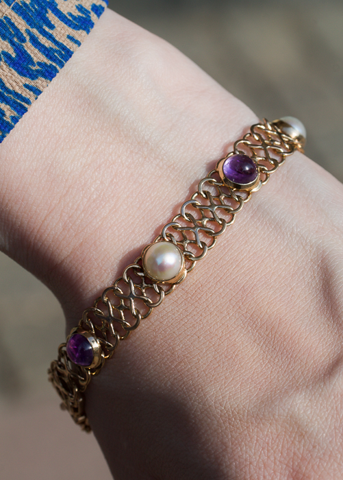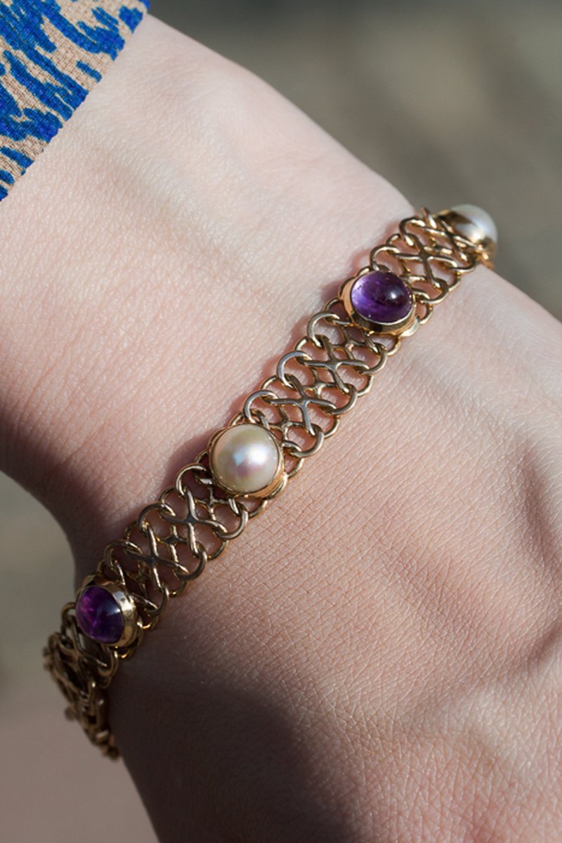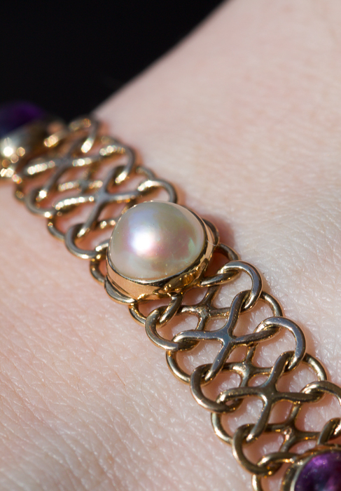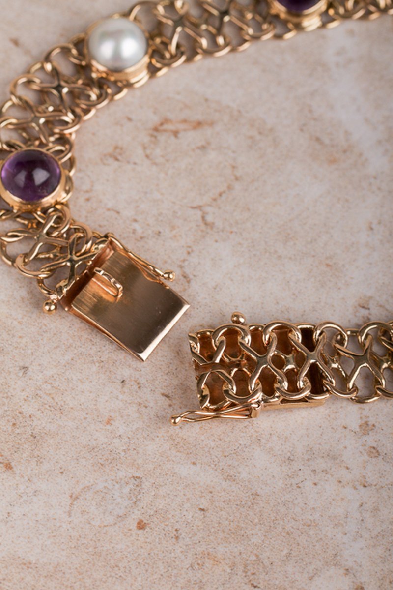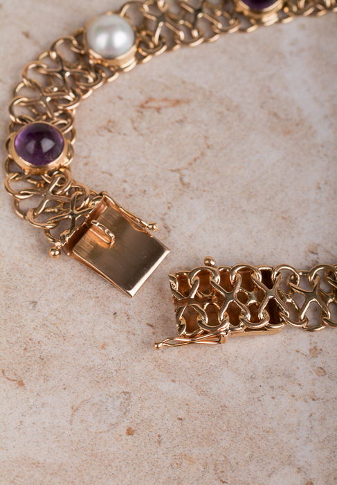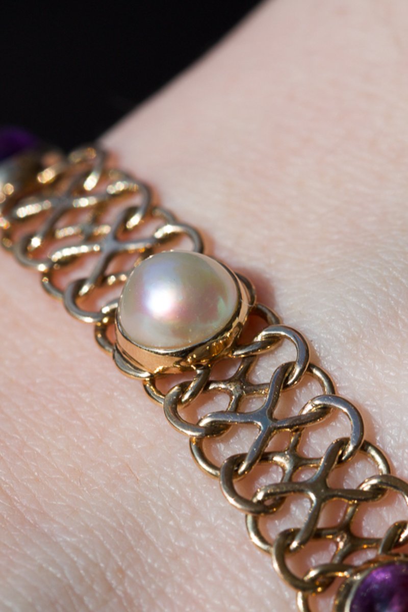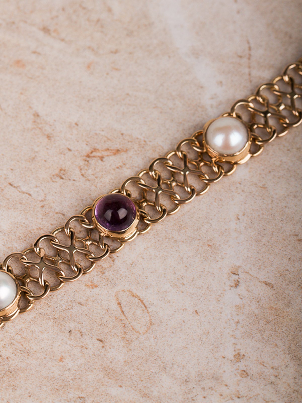18k guld, tre st odlade halvpärlor och fyra st ametister 6,5 mm